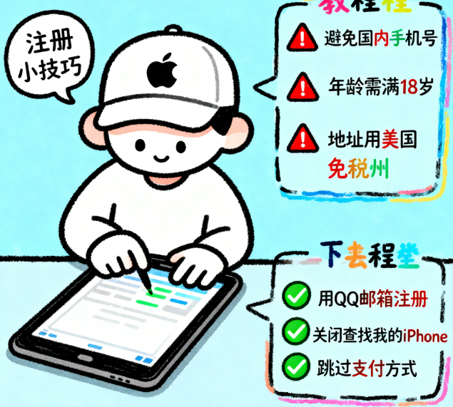 解决办法:① 换设备重试(电脑换手机,或反之),更新设备系统和浏览器至最新版本;② 检查网络稳定性,更换科学上网节点后再试;③ 若以上均无效,先注册一个非美区账号(如加拿大区),登录后在appleid.apple.com修改国家/地区为美国,填写免税州地址和“None”付款方式,修改前需用完账号余额、取消所有订阅。