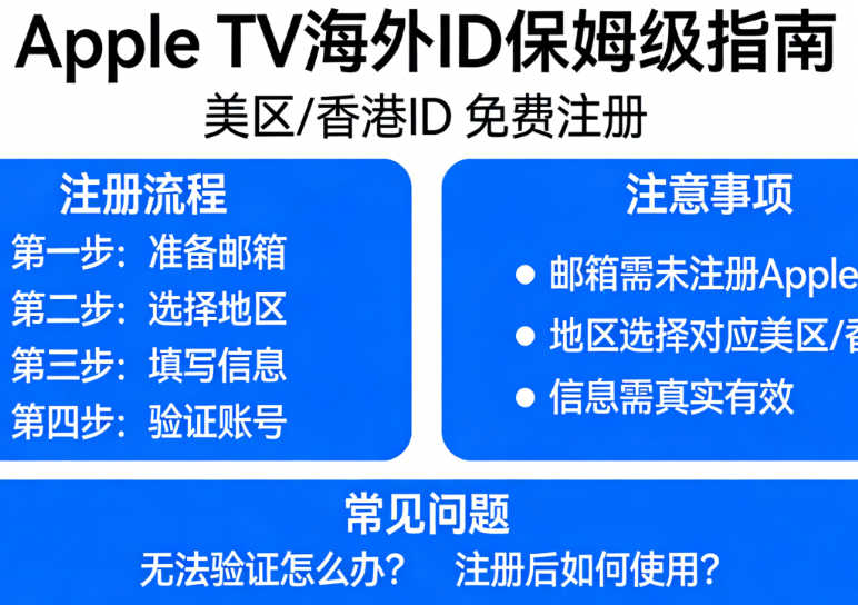 新手用Apple TV看海外流媒体、下载专属应用,最头疼的就是“美区/香港ID”相关问题:不知道怎么免费弄海外Apple ID、注册时总卡壳、担心必须开iCloud才能登录,甚至误用共享ID导致账号被锁、设备受限。
